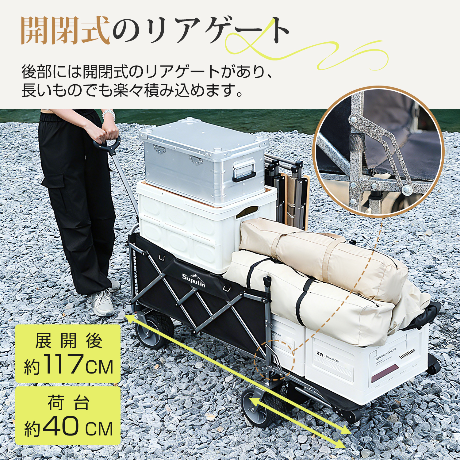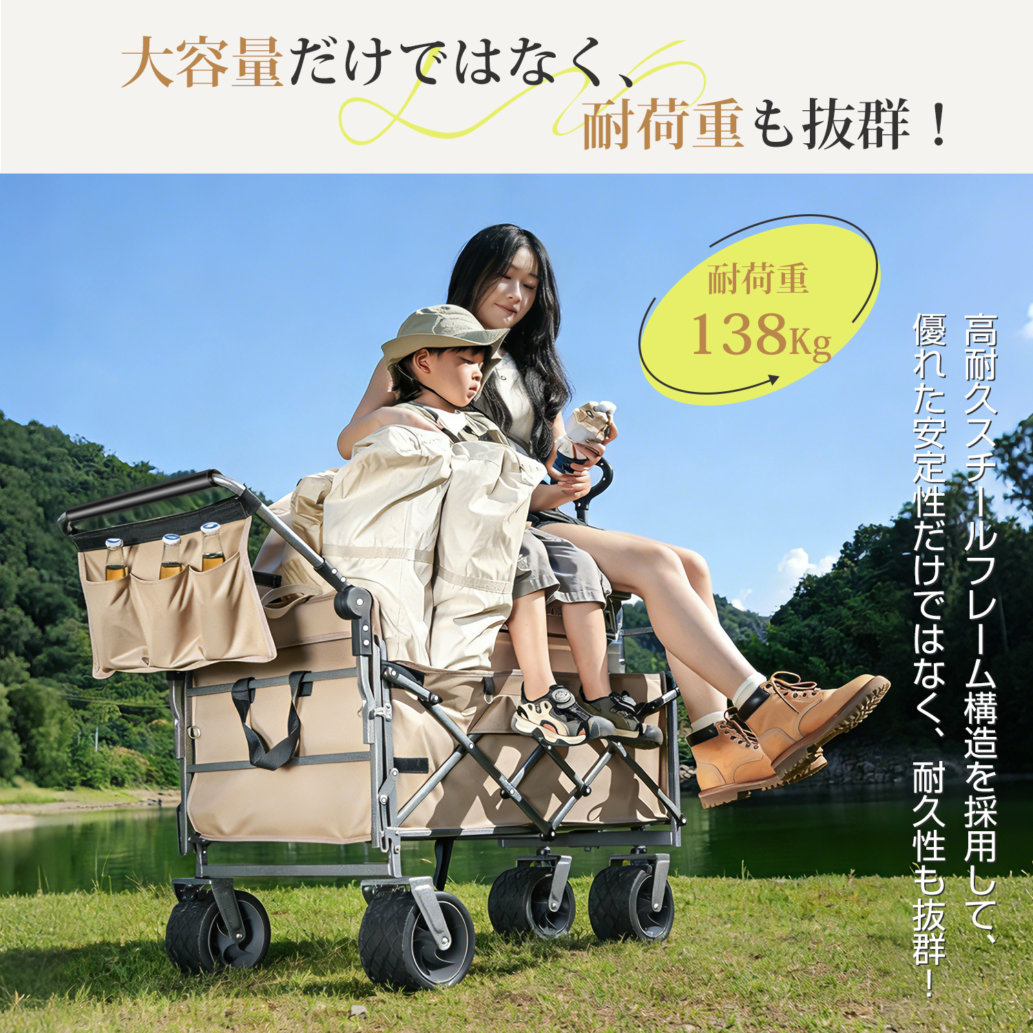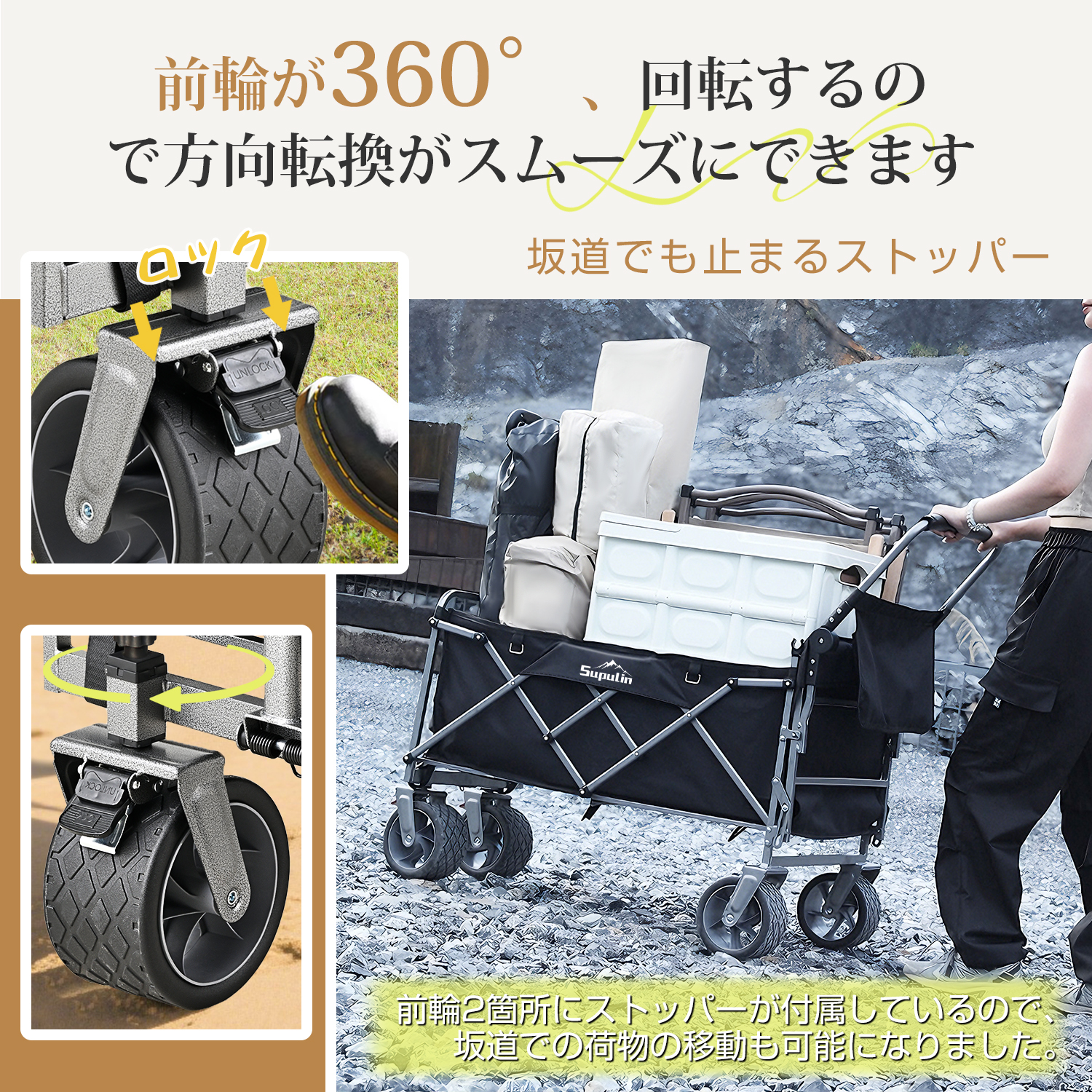 「ワゴン業界で最大サイズのタイヤ」とこでも、どんな場所までも平然と行ける、ワゴン業界で最大サイズのタイヤ!タイヤの直径は17センチ、幅の太さは9センチ!また、タイヤの転がりもスムーズになります!360度回転可能で、操作も便利!従来のタイヤより大きく、より頑丈、より使いやすいタイヤ!山でも砂利道でも湿った砂浜でも楽々移動可能、アウトドアで最適です。
