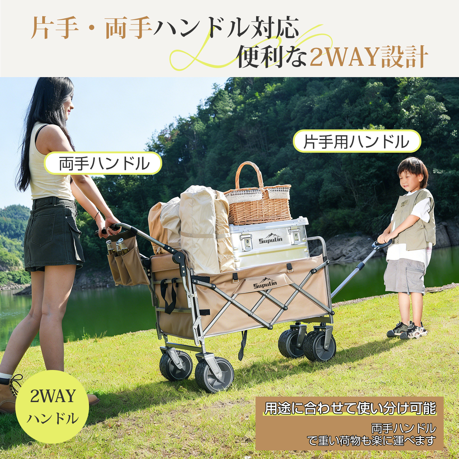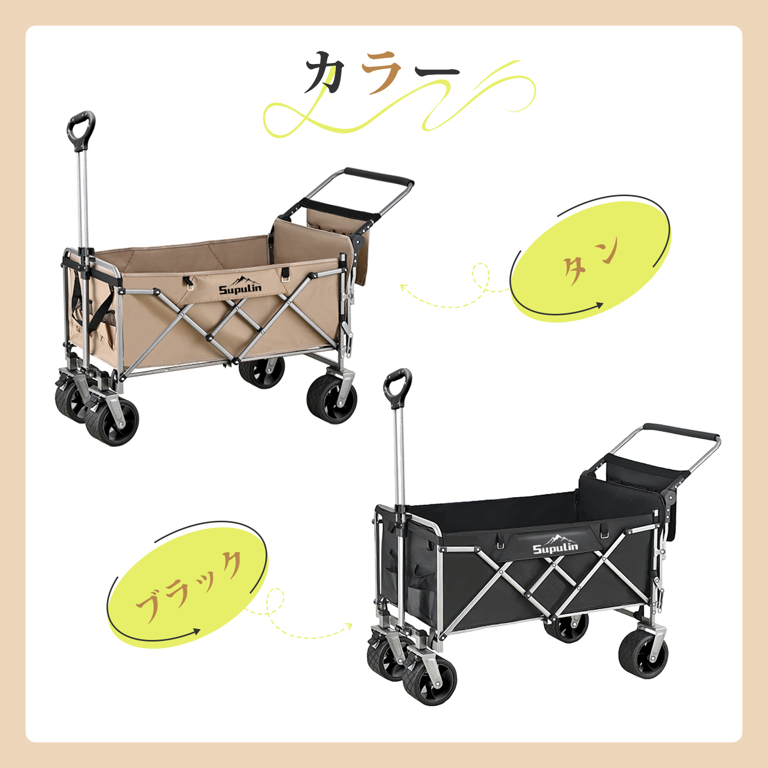 キャリーワゴンを便利に操れるように持ちやすいハンドル形状に設計しています。ハンドルの高さは72~98CM調整可能、身長やシーンにより自由に調整できます。また、本体から引っ張って角度調整もできます。さらに便利なアウトドア活動に役にたちます。