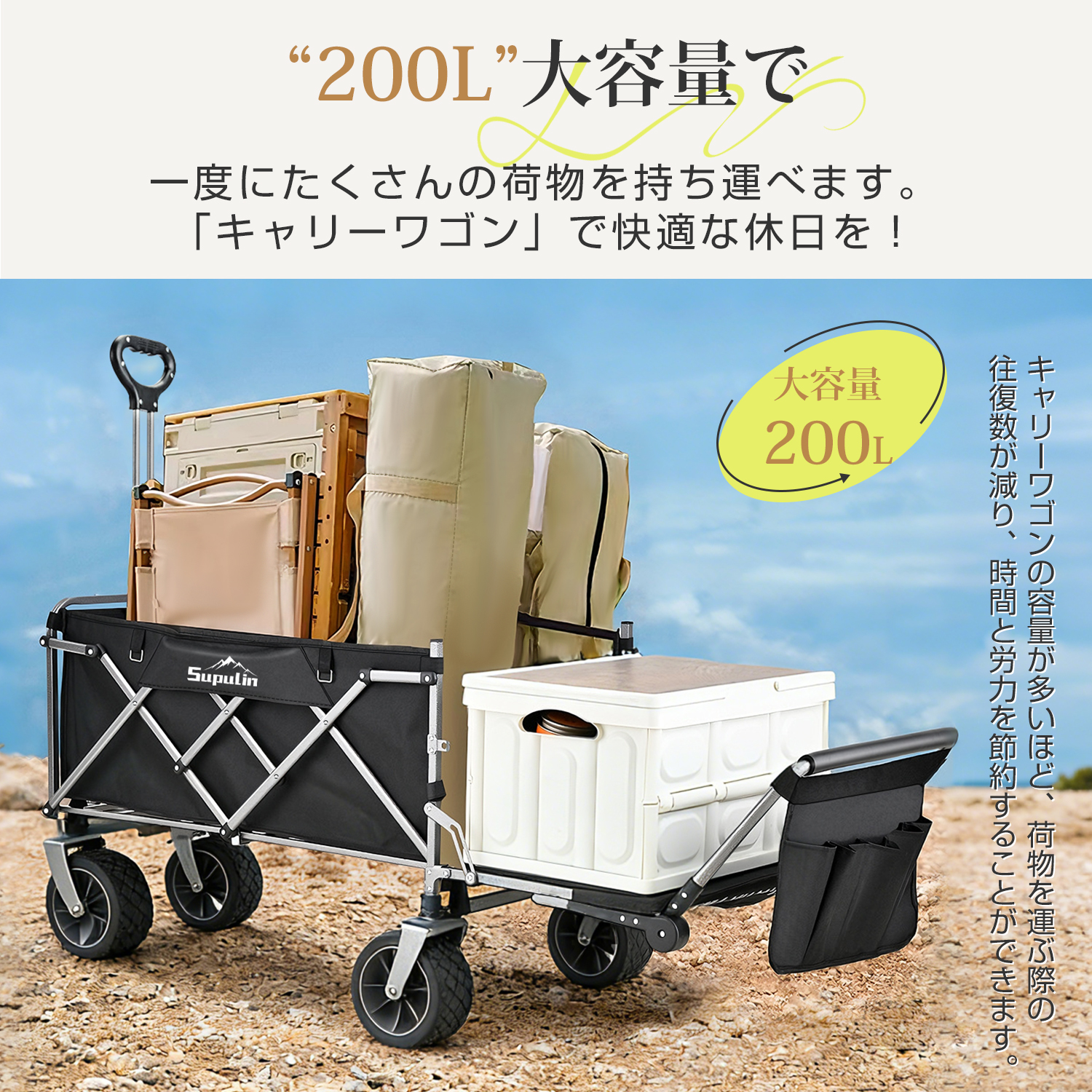 弊社のキャリーワゴンはしっかりとしたスチールフレームに加え138kgの耐荷重が実現できます。200L大容量でたくさんの荷物も1度で運ぶことができます。