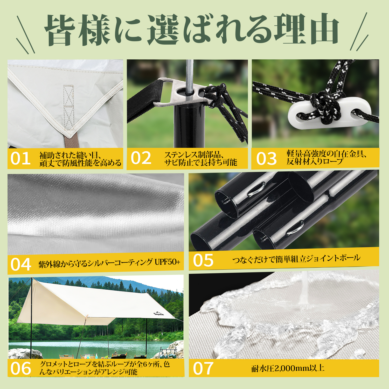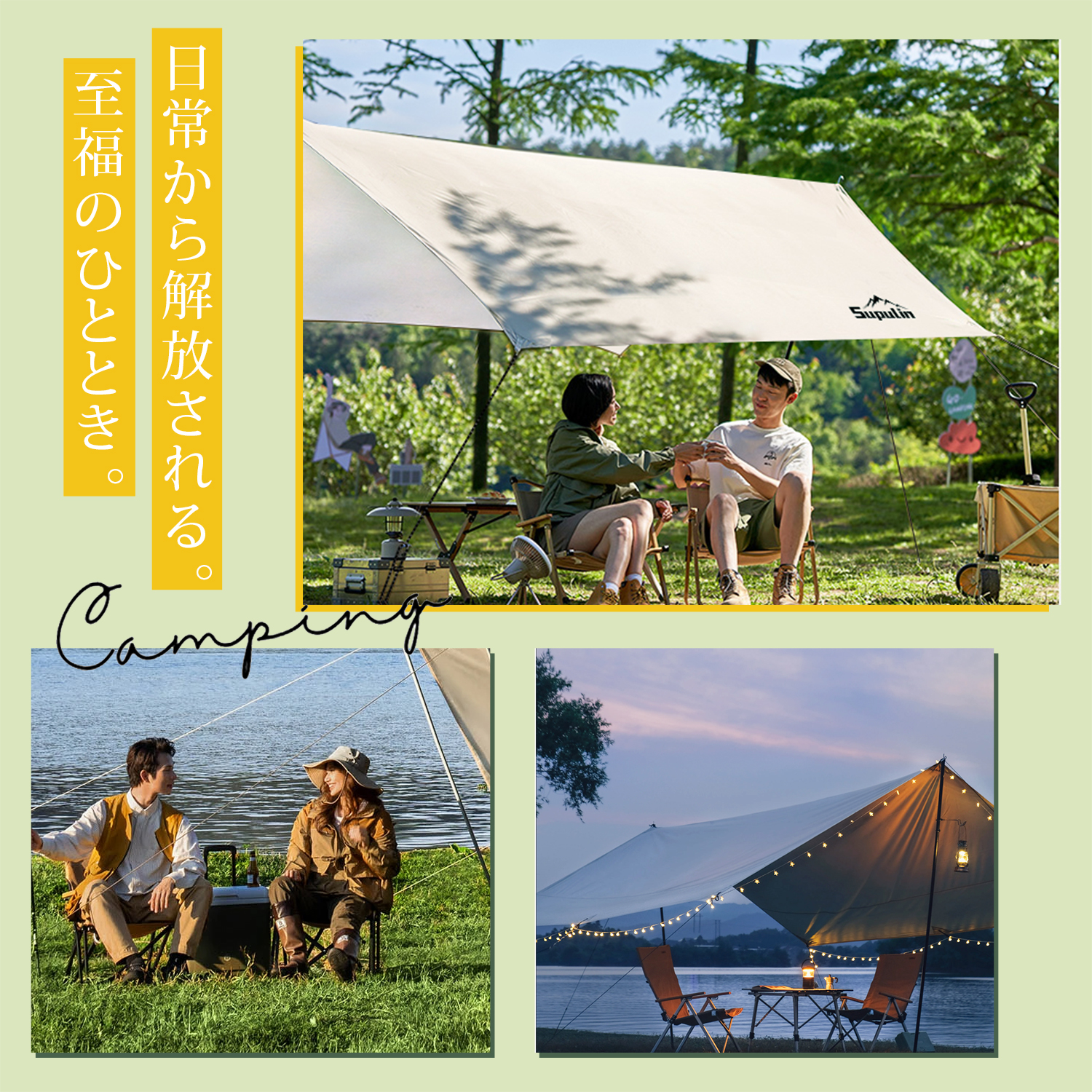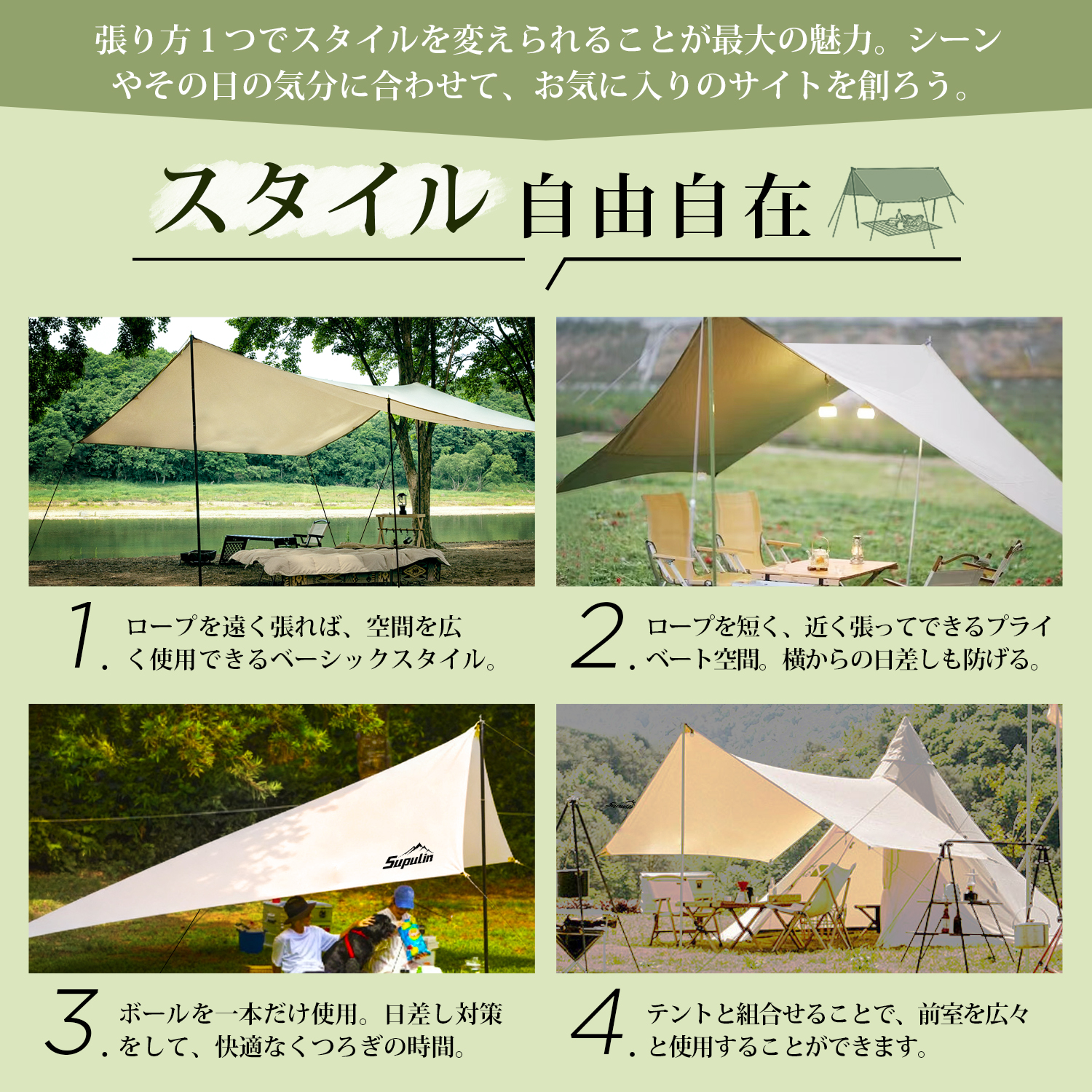 商品名:Supulin タープ仕様:適応人数:6-10人サイズ:400cm*292cm材質:ポリエステル重量:3.2KGパッケージ内容:タープ、サイドロープ*4、ホール*2、ベグ*6、センターロープ*2、ハンマー、収納バッグ
