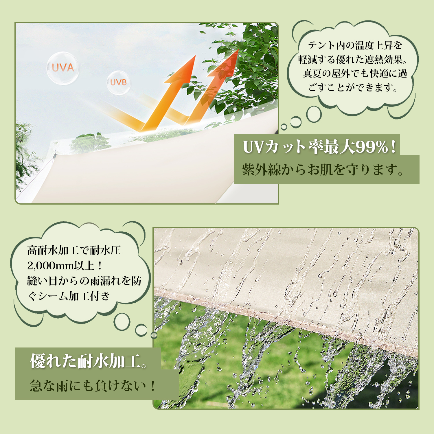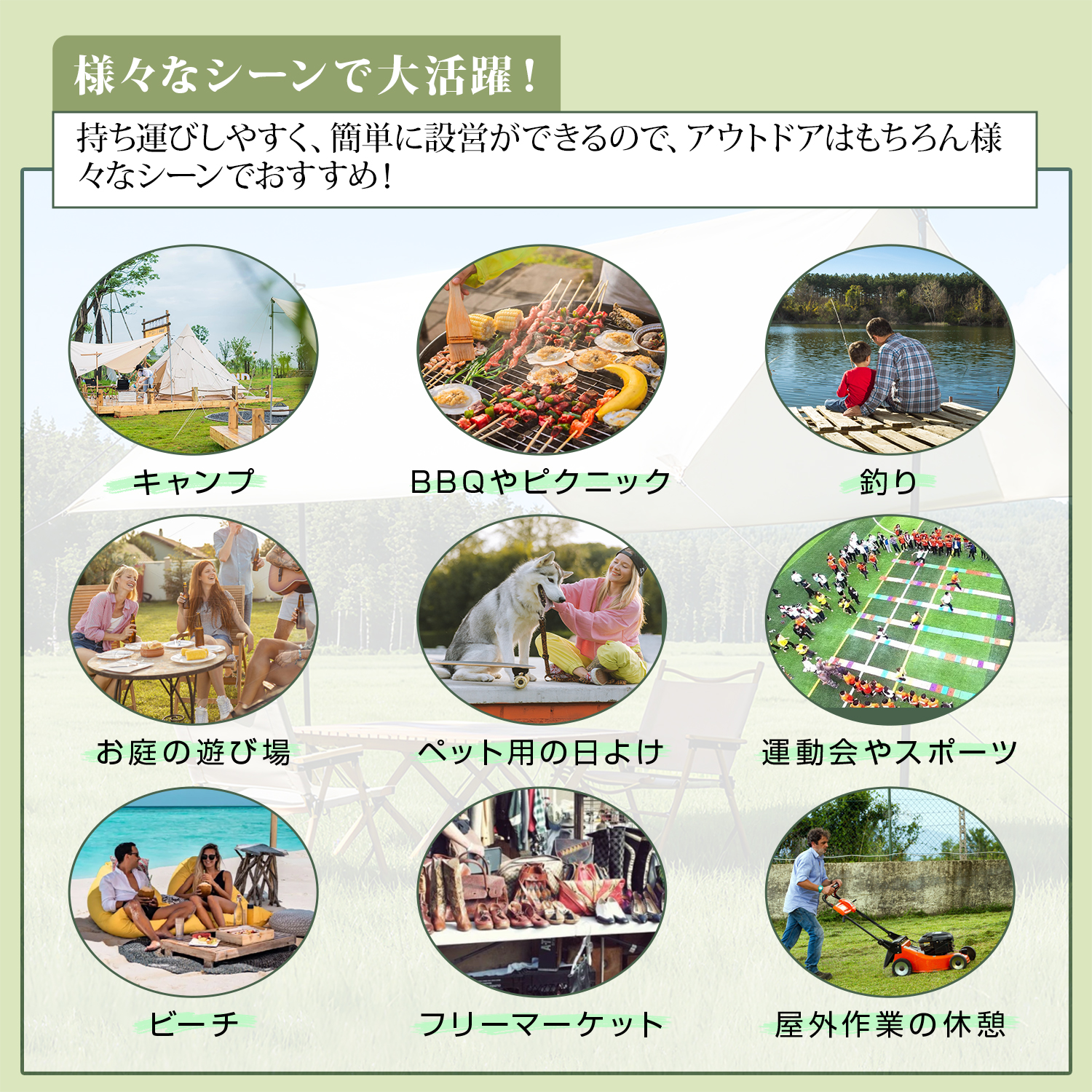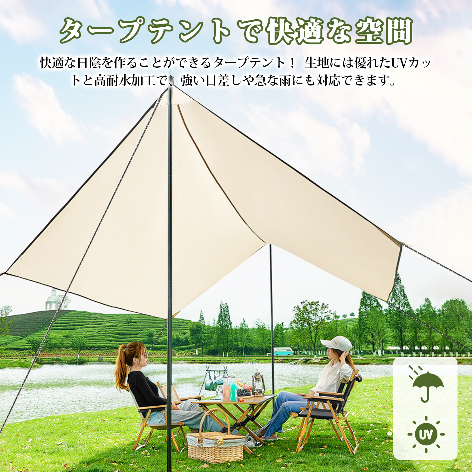 商品名:Supulin タープ仕様:適応人数:6-10人サイズ:400cm*292cm材質:ポリエステル重量:3.2KGパッケージ内容:タープ、サイドロープ*4、ホール*2、ベグ*6、センターロープ*2、ハンマー、収納バッグ