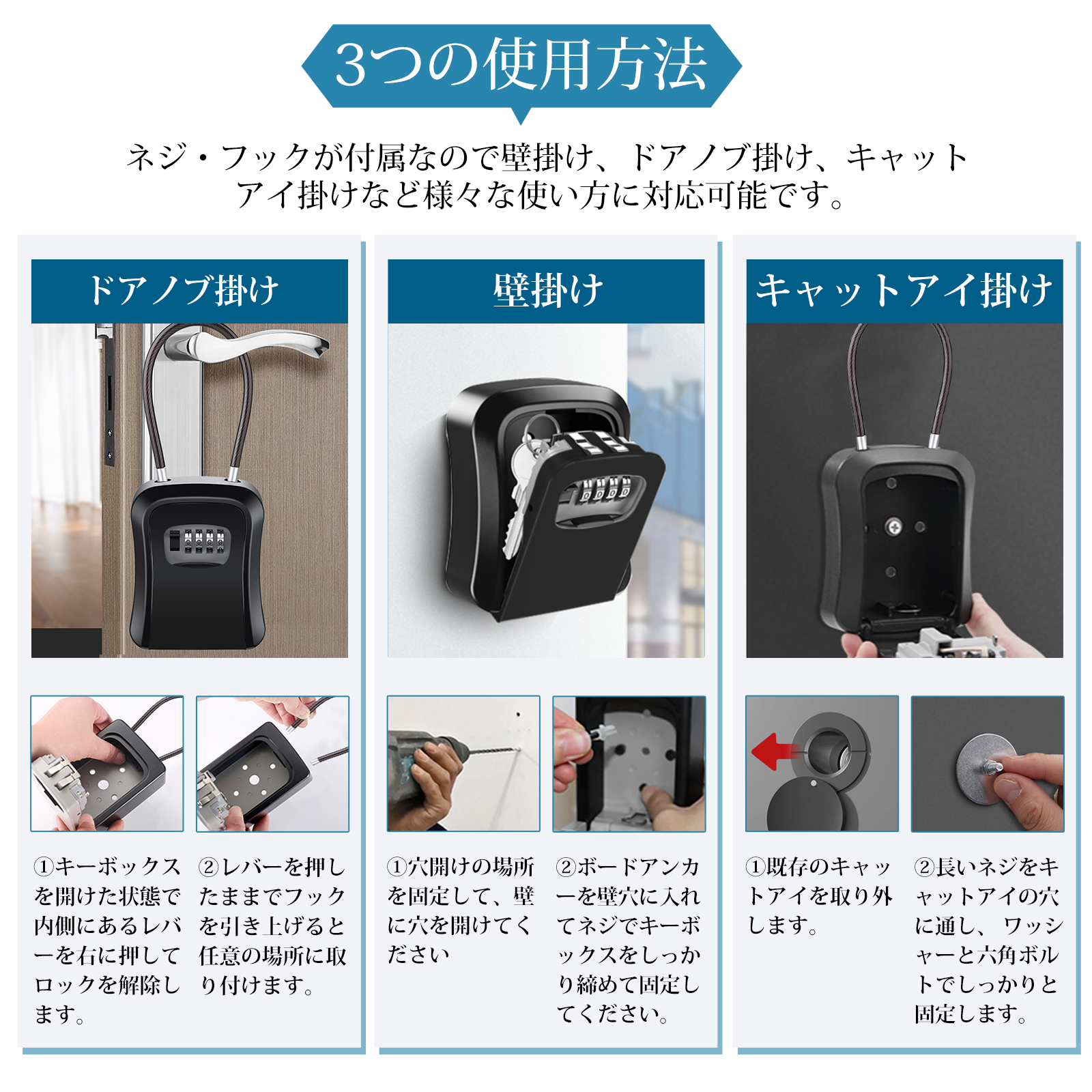 付属品:アンカーボルト×4枚, キーボックス×1個, ネジ×4枚+長いネジ×1枚, ワッシャー×1枚, 六角ボルト×1枚